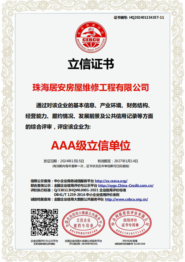 珠海居安房屋維修工程有限公司成立于2020年,是一家專注房屋維修的公司。我們擁有各類型專業(yè)人才,業(yè)務包括老舊建筑翻新改造、外墻空鼓修復、防水幕墻養(yǎng)護、外墻預置構件拆除更換、供排水管網改造、墻面翻新、鋼制結構建筑構建及折除,外墻清洗及裝修裝飾。 公司自成立以來,始終堅持以人為本、誠信敬業(yè)的經營原則,與多家單位達成固定維修、養(yǎng)護清洗協(xié)儀,業(yè)務遍及廣州、東莞、中山、珠海等多個周邊城市。專業(yè)化團隊尤其在墻面及窗邊防水工程業(yè)內知名。…… >>> 更多內容 |